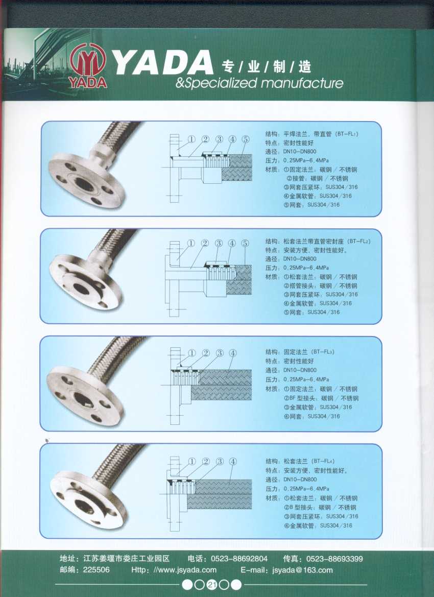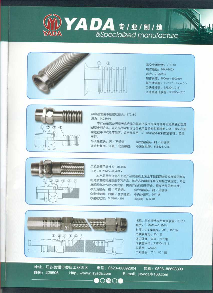 秉天時 籍地利 仰人和 虔誠一個永恒的理念,創(chuàng)新永續(xù).百諾不如一信,亞達(dá)人堅持以信為本,視客戶如同上帝,把對信譽(yù)的追求,體現(xiàn)在嚴(yán)格的質(zhì)量控制和完善的客戶服務(wù)上,讓客戶百分之百滿意是亞達(dá)人不變的信念。 本廠系ISO9001質(zhì)量認(rèn)證企業(yè)、計量合格企業(yè)。本廠專業(yè)致力于生產(chǎn)不銹鋼金屬波紋軟管、超高壓、高壓膠管、波紋管補(bǔ)償器(膨脹節(jié))、立式、臥式、冷卻器。本廠產(chǎn)品具有承受壓力高、彎曲半徑小、抗疲勞性能強(qiáng)、使用壽命長等特點(diǎn)。廣泛應(yīng)用于電力、石化、冶金、水泥建材、工程機(jī)械、礦山及液壓系統(tǒng)。產(chǎn)品暢銷全國各地。 今日亞達(dá)之成功源自諸多客戶的厚愛,明天的輝煌更離不開您對我的支持與信賴。查看更多>>